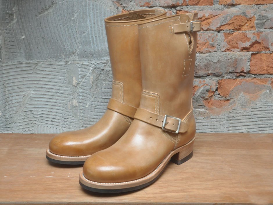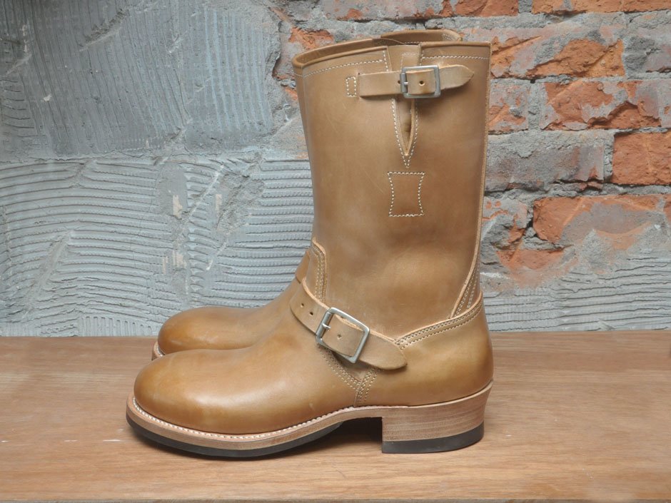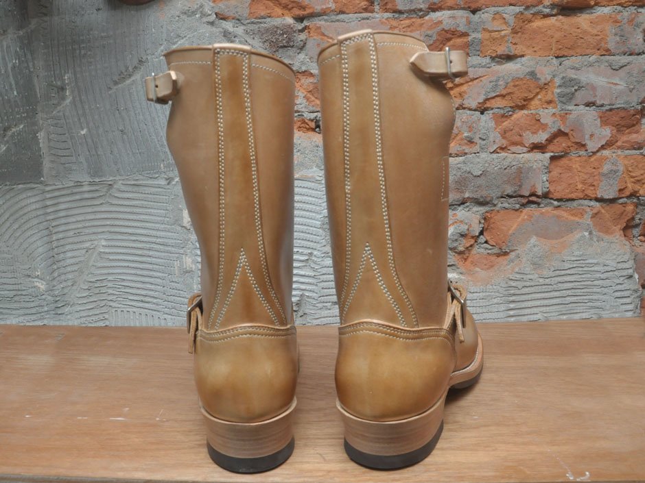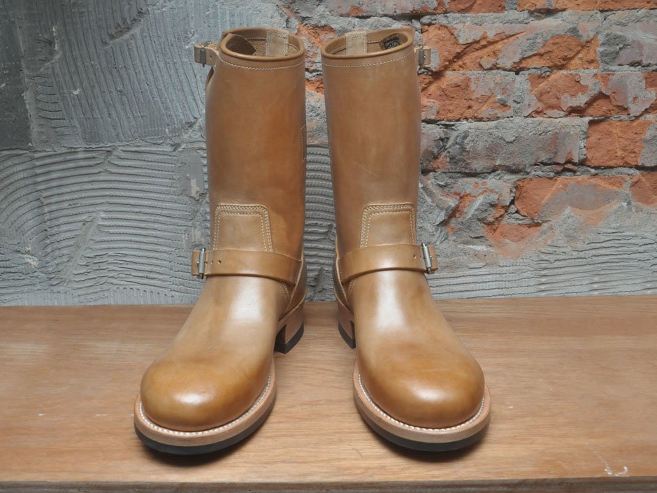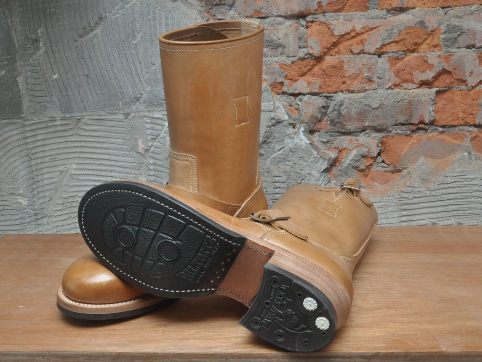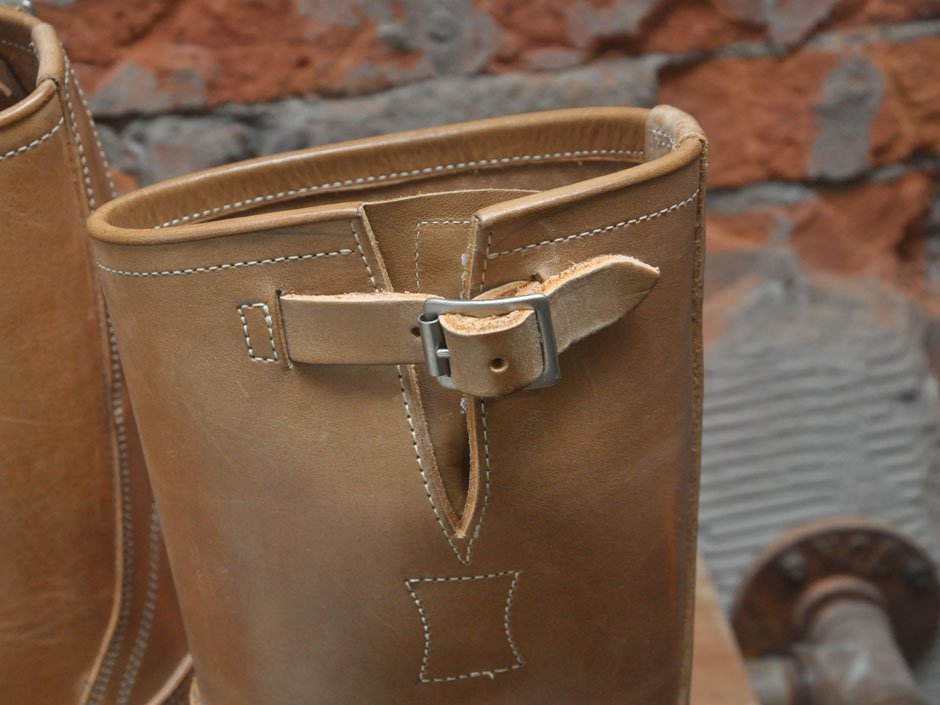 延續經典的 11 吋筒高,並使用傳統的手縫沿條製法 (Hand Sewn Welted),鞋面沿條下則以皮革中底搭配美國老靴中常見的 ”Biltrite” 前掌底與 “Cat’s Paw” 橡膠止滑跟底,再結合黃銅鍍鎳 Roller Buckles 與根據 30 年代古董靴外型所開發的 “Work Round” 原創寬扁楦頭,呈現出極富曲線美感與老味氛圍的獨特造型。